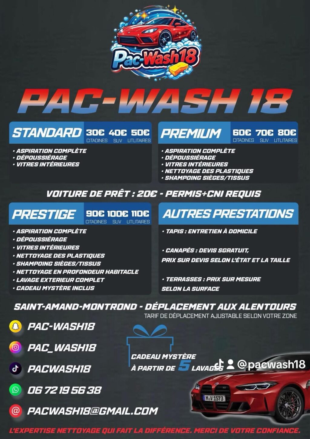 Téléphone : 06.72.19.56.38 / Facebook : Pac Wash / Instagram : @pac_wash18